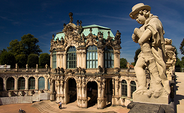 Zwinger: Dacă există o clădire care să reprezinte glorificarea splendorii baroce din Dresda, aceasta este clădirea Zwinger (1719). Întregul ansamblu al palatului de proporții uluitoare, cu impresionanta curte interioară cu fântâni ornamentale, sculpturi și grădini, a fost construit ca reședință pentru vacanțele regale. În zilele noastre găzduiește muzee de artă deosebit de valoroase, precum „Galeria Marilor Maeștri”.