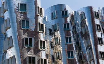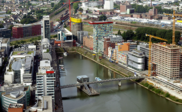 Neuer Zollhof: acest ansamblu post-modernist compus din trei clădiri a fost construit în anii '90 și poartă semnătura arhitectului canadian de renume mondial Frank O. Gehry. Construite pe malul Rinului, cele trei clădiri par o sculptură futuristă gigantică și domină peisajul urban al orașului cu fațadele lor de calcar alb, oțel și cărămidă și pereții înclinați și formele curbate. Construcția lor a avut loc în același timp cu lucrările radicale de renovare a portului din Düsseldorf, iar în prezent sunt utilizate drept clădiri de birouri, fiind situate în cartierul modern MedienHafen. Adresă: Stromstraße 26