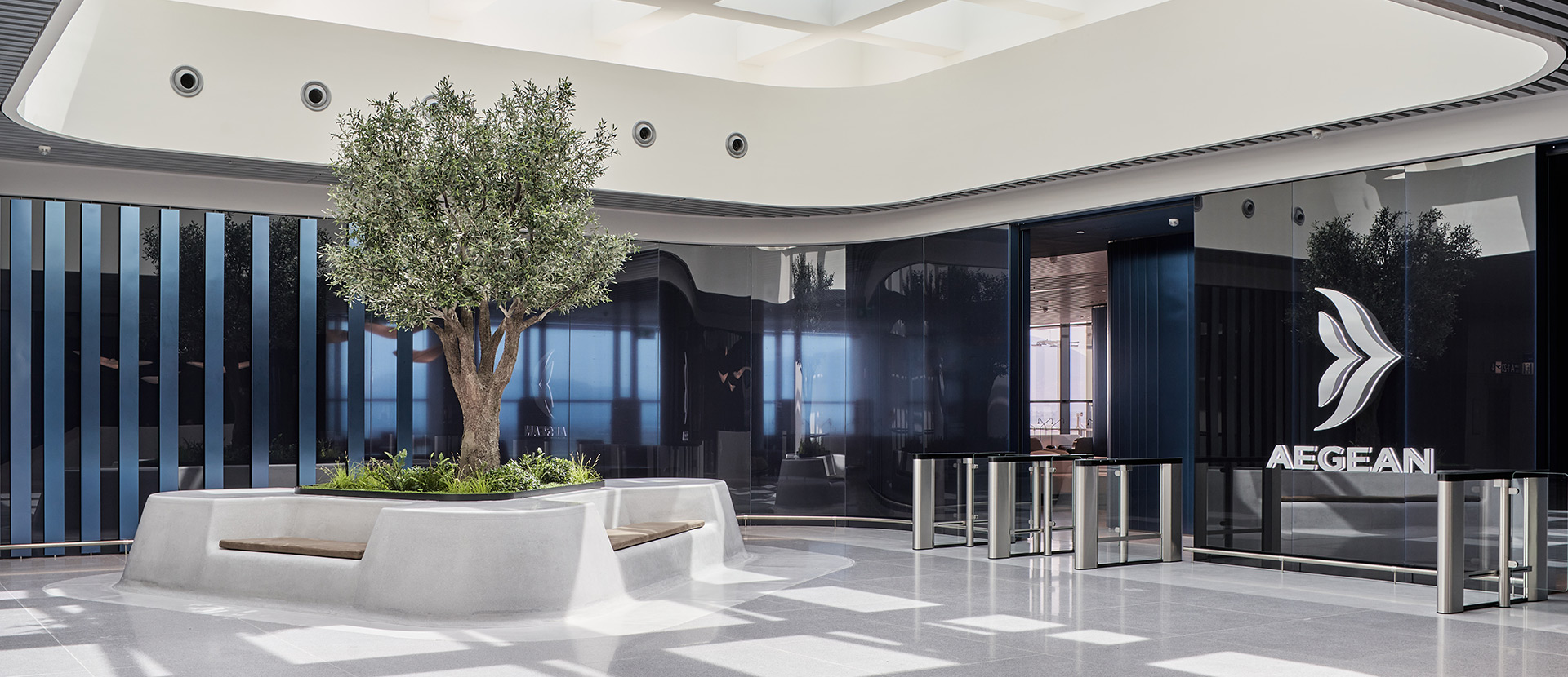 Designul este inspirat de arhitectura simplă și elegantă a Greciei, reflectă tehnologia de ultimă generație a aeronavelor noastre și încorporează noua noastră identitate de marcă. Marginile curbe, line și formele fluide, împreună cu o combinație de materiale de înaltă calitate, cum ar fi marmura, teracota, sticla și lemnul, dau viață unui spațiu modern, de ultimă generație, construit în jurul confortului dvs.
